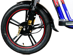 Xe đạp điện Sonsu Ruby có bánh trước với vành đúc hợp kim 5 chấu đôi hoàn hảo, được phủ bởi một lớp sơn tĩnh điện màu đen huyền bí và điểm nhấn với viền chỉ đỏ bao quanh. Ở tâm của vành xe là thắng cơ an toàn được thừa kế từ công nghệ thắng sử dụng cho xe gắn máy, được đồng bộ hoàn toàn với tay thắng phía trên giúp người sử dụng dễ dàng làm chủ tốc độ trong quá trình vận hành. Nối phần bánh trước với thân xe là cặp giảm sóc êm ái, giúp xe có thể vận hành một cách dễ dàng qua các địa hình.
